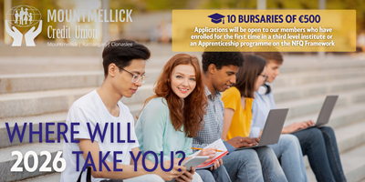 Mountmellick Credit Union is offering ten bursaries of €500 each to students who finished school in 2025 at: